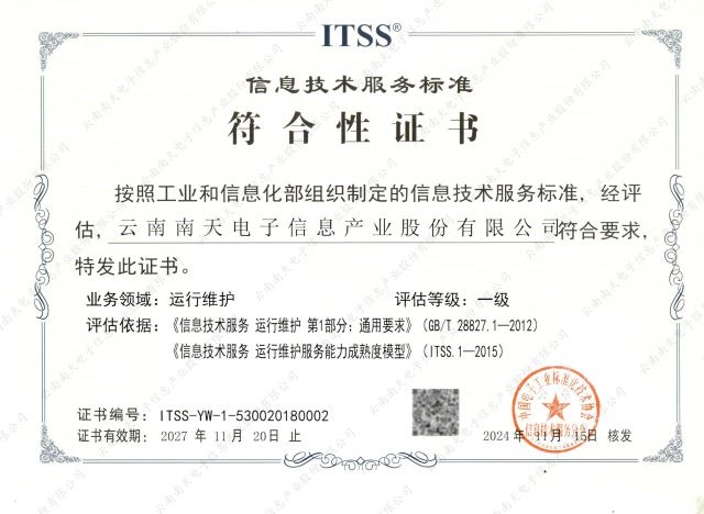 信息手艺服务运行维护标准(ITSS)是在工业和信息化部、国家标准化委向导和支持下,由ITSS分会研制的一套IT服务标准库和要领论,周全规范了职员、资源、手艺、历程等IT服务产品及其组成要素,具有极高的权威性,被以为是海内IT行业的主要评估准则。ITSS运维服务能力成熟度一级为该项评估的最高品级。