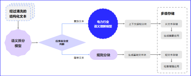 基于语义特征评估系统,对预处置惩罚后的文本举行多维度语义剖析(包括知识关联度、信息完整性等指标),针对高重漂后的专业内容,依托电力行业专用语义明确模子实验上下文感知分块处置惩罚,同步天生领域知识摘要索引;对基础性信息则接纳规则驱动的轻量化分块机制,构建分级存储拓扑结构,实现检索效率与存储本钱的最优平衡,为电力知识库建设提供清静可靠的数据治理支持。