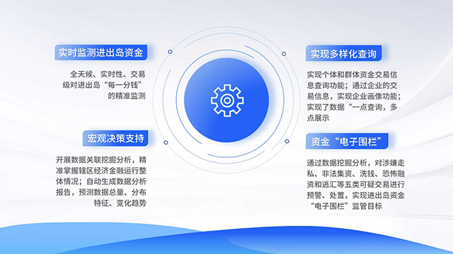 海南自贸港资金流监测平台是为响应海南省政府关于资金流信息监测的系统要求,着力构建顺应自贸港生长需要的监测平台系统,是天下首个实时收罗银行资金生意数据的数据监测平台。资金流信息监测平台致力于在危害可控的条件下,推动海南资金流动自由、自主、高效、清静、有序流动,同时为省政府提供资金流宏观信息,辅助科学决议,排查金融危害提供有力支持,该项目曾荣获第一届“海南省刷新和制度立异奖”一等奖。