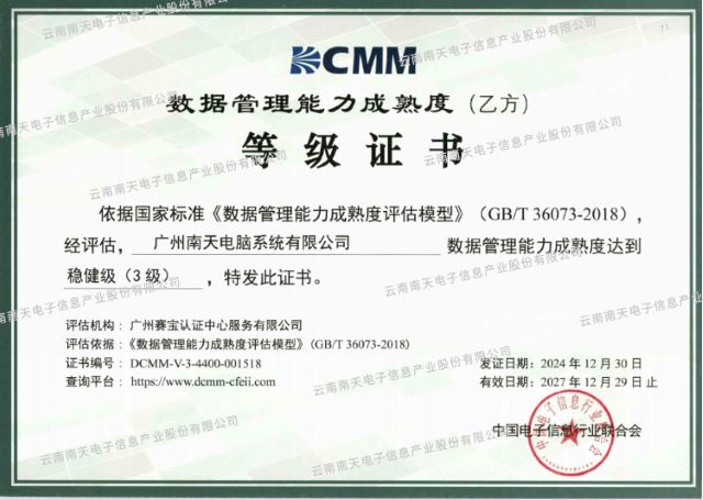 克日,经中国电子信息行业团结会评估认证,腾博tengbo9885官网信息全资子公司广州腾博tengbo9885官网电脑系统有限公司乐成通过数据管理能力成熟度稳健级(3级)认证,标记着公司数据管理能力抵达行业先进水平,数字化水平建设再上新台阶。